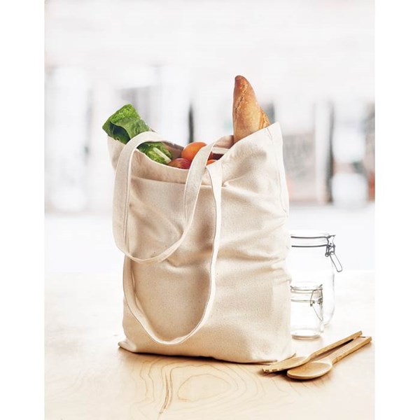 Plátěná nákupní taška s dlouhými držadly a složeným dnem. 270 gr/m². Vyrobeno standardem OEKO-TEX.
