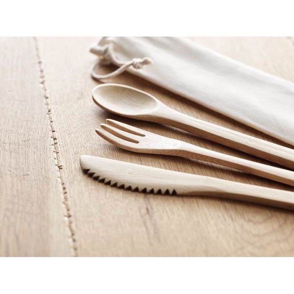 Znovupoužitelný příborový set (vidlička, nůž, lžíce), vyrobeno z bambusu. Plátěné pouzdro.