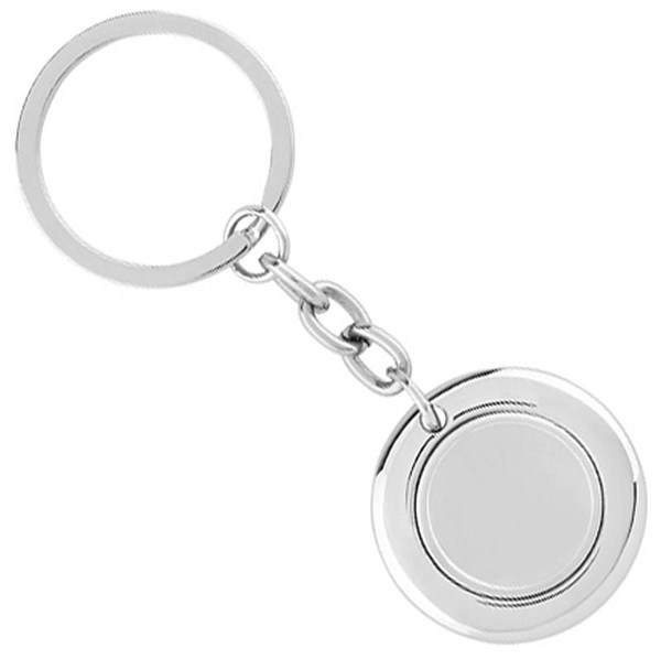 Přívěsek/ klíčenka kruhového tvaru s krátkým řetízkem, kroužkem na klíče a lesklým kovovým magnetiským žetonem.