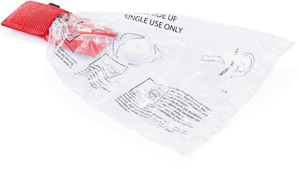 Kapesní maska pro KPR (resuscitace dýchání z úst do úst) v kapsičce s klíčenkou. Splňuje normu EN 13485:2003