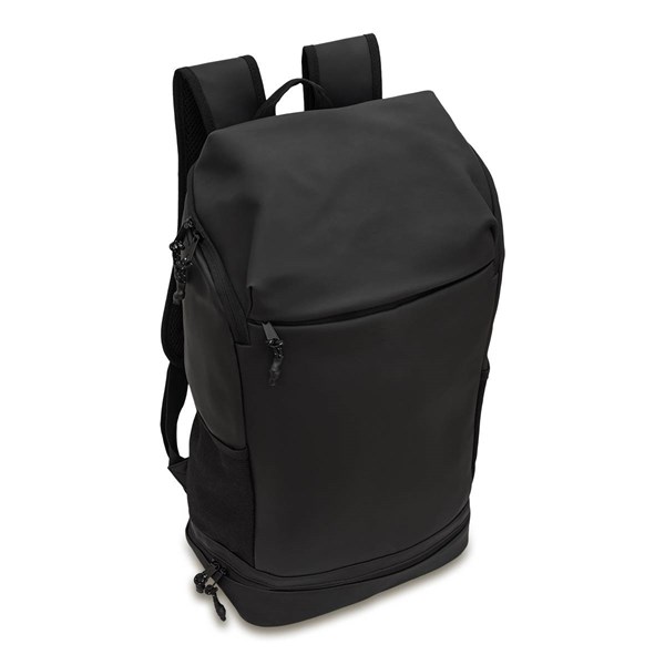 Prostorný batoh z voděodolné PU tkaniny má hlavní přihrádku s malou vnitřní kapsou na zip, velkou kapsu na zip v přední části, velkou spodní kapsu, 2 boční síťované kapsy a nastavitelný hrudní popruh s přezkou. Pohodlná měkká záda z pěny a měkké pěnové ramenní popruhy se síťovinou. Polyesterová podšívka. Vnitřní švy jsou zpevněny polyesterovým popruhem. Kapacita 30 l.