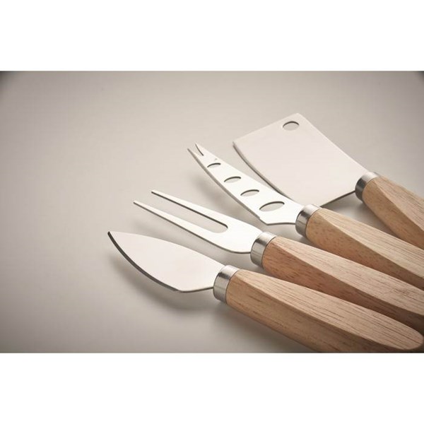 Sada 3 servírovacích nožů a 1 vidličky na sýr. Vyrobeno z nerezové oceli s rukojetí z kaučukového dřeva.
