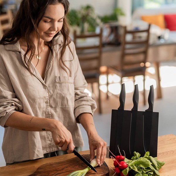 Sada 4 nožů na magnetickém bloku z MDF. Sada obsahuje šéfkuchařský nůž, filetovací nůž, nůž na pečivo a univerzální krájecí nůž. Vyrobeno z vysoce kvalitní nerezové oceli s protipřilnavou povrchovou úpravou pro zvýšenou odolnost a přesnost krájení. Ocel, MDF.