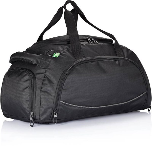 Sportovní černá polyesterová taška 600D má ripstop, přední kapsu na zip s organizérem, boční kapsu, kapsa na boty. Ucha a ramenní popruh jsou z popruhoviny. Na spodku jsou 4 výstupky pro postavení tašky na zem. Materiál bez PVC. Obvykle baleno jednotlivě v sáčku.
