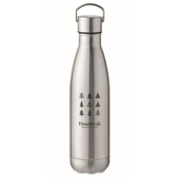 Izolační láhev z recyklované nerezové oceli (90 % recyklované nerezové oceli a 10 % nerezové oceli) ve tvaru kuželky, víčko s držadlem z totožného materiálu, objem: 500 ml. Potisk je možné umístit na tělo láhve (tampon, laser 30x60 mm), nebo na víčko (tampon, laser 30x30 mm). Cena rotačního digitálního tisku, nebo rotačního laseru (216x 110 mm) na vyžádání.