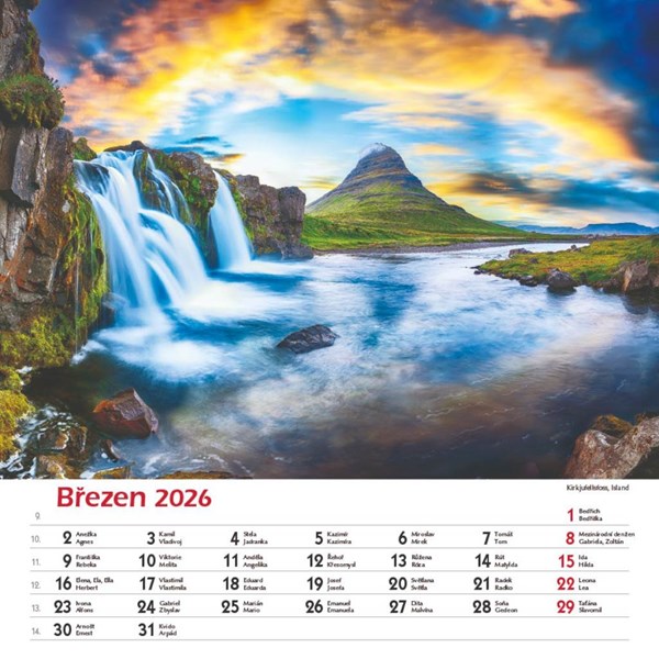 Nástěnný kalendář s vazbou na spirále má české jmenné kalendárium s vyznačením českých státních svátků a obálku obohacenou o disperzní lak a text. Pro reklamní dotisk je k dispozici spodní reklamní plocha o max. rozměru 330 x 60 mm. Součástí každého kalendáře je volně přiložená transparentní igelitová taška. V případě zájmu o jednotlivé vložení kalendáře přímo do tašky bude účtován manipulační poplatek +1,50 Kč/ks.