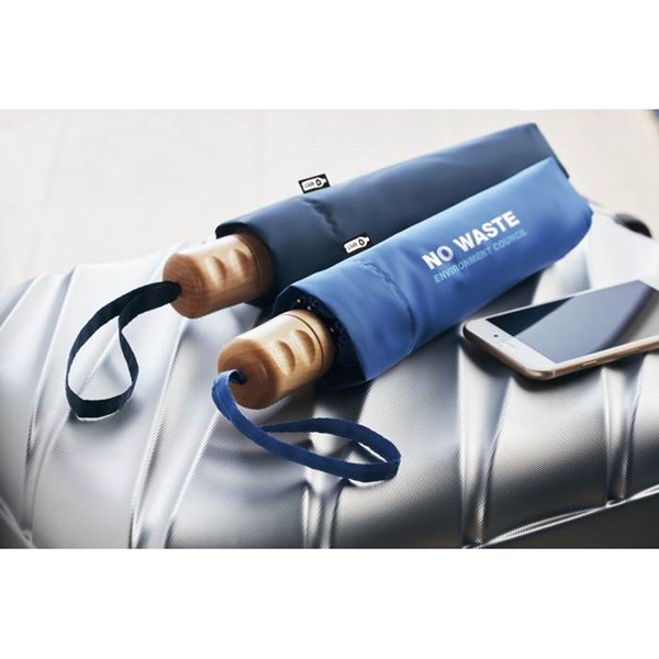 Manuální skládací 21palcový deštník, 3-dílná konstrukce, potah je vyrobený ze 190T RPET pongee tkaniny. Deštník má černou pokovenou konstrukci, dřevěné držadlo a obal ze shodné tkaniny.