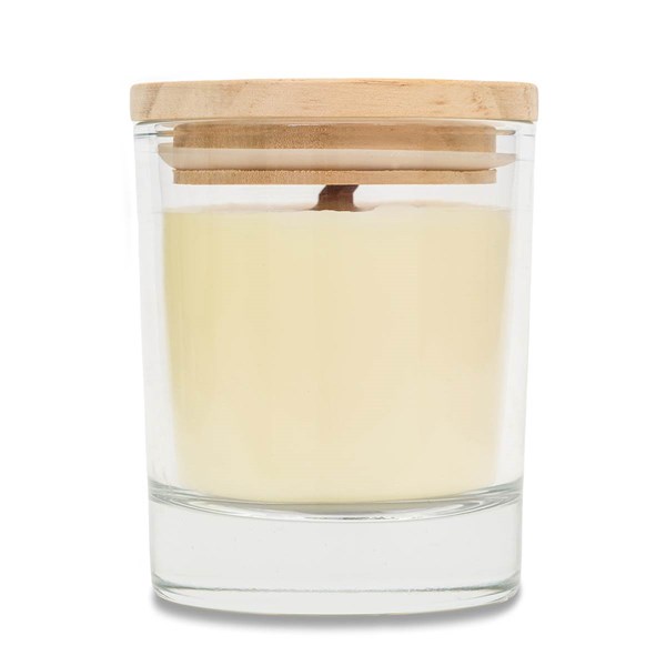 Svíčka ze sójového vosku ve svícnu ze skla, s knotem ze dřeva a víčkem ze dřeva. Aroma svíčky je harmonická kombinace sladkých jahod, třešní a šťavnatých broskví.