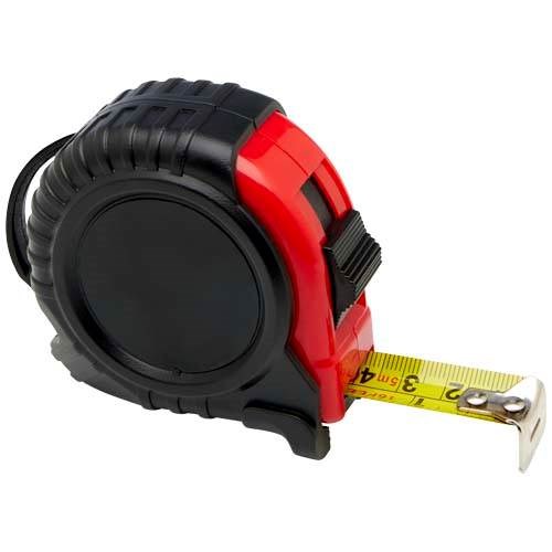 Pětimetrový svinovací metr uvádějící délku v centimetrech a palcích. Materiál: ABS plast, Ocel.