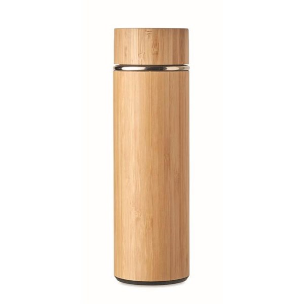 Dvouplášťová vakuová termoska z nerezové oceli a bambusu s vnitřním čajovým sítkem. Objem 480 ml. Bambus je přírodní produkt, jednotlivé kusy se mohou lišit v barvě, taktéž odstín vylaserovaného loga může být u každého kusu jiný.