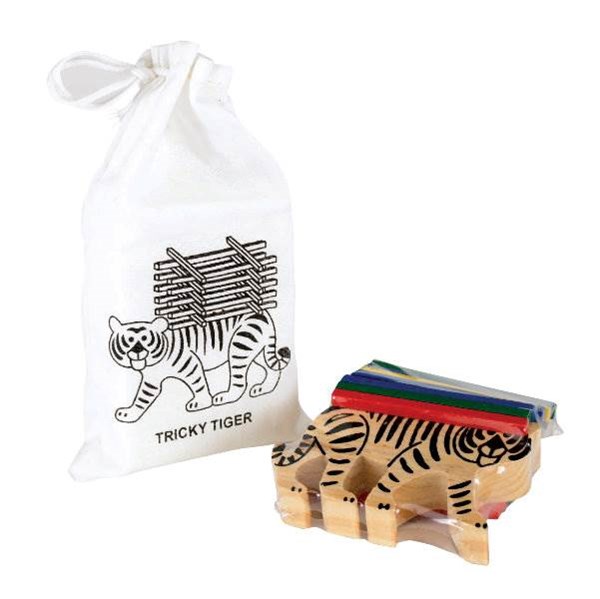 Dřevěná hra TIGER pro utužení trpělivosti. Balení obsahuje dřevěného tygra s černým potiskem, 24 ks dřevěných tyček ve 4 barvách a sáček z ekologické bavlny s jednostranným zobrazením tygřího hlavolamu se zatahovací šňůrkou.
