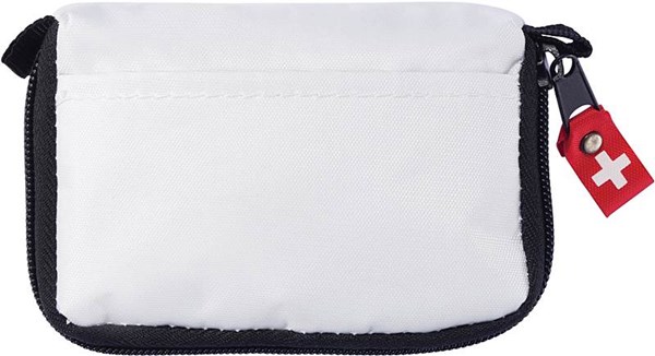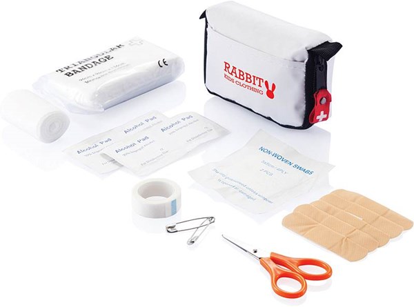 Taštička s jednou přední kapsou, jedním černým hlavním oddílem na zip a očkem na pásek na zadní straně taštičky. Obsah: trojcípý šátek, PBT obinadlo, dezinfekční tampon, náplasti, nůžky, zavírací špendlík a leukoplast.Vyhovuje normě EN 13485:2003. Obvykle baleno jednotlivě v sáčku.