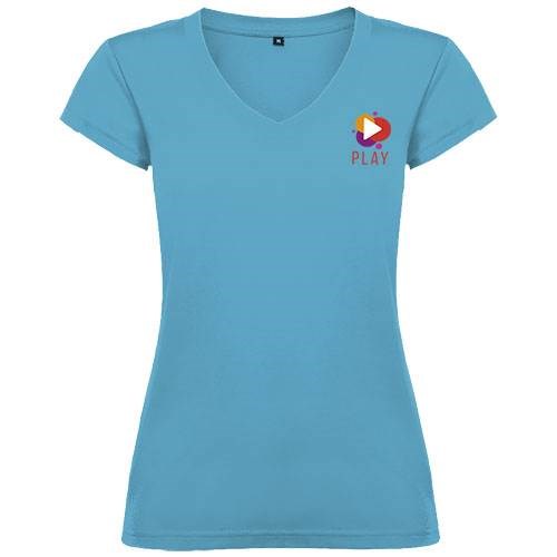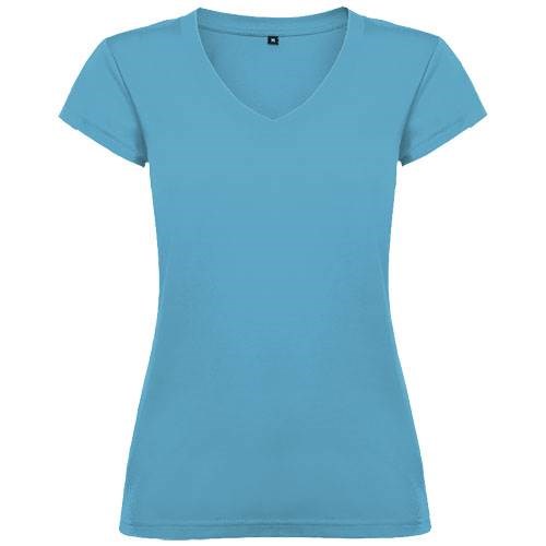Dámské tričko s krátkým rukávem a výstřihem do V s úpravou 1x1 žebrování. Úzký střih s bočními švy. Odnímatelný štítek. Jednolícní žerzej 100% bavlna, 155 g/m2.