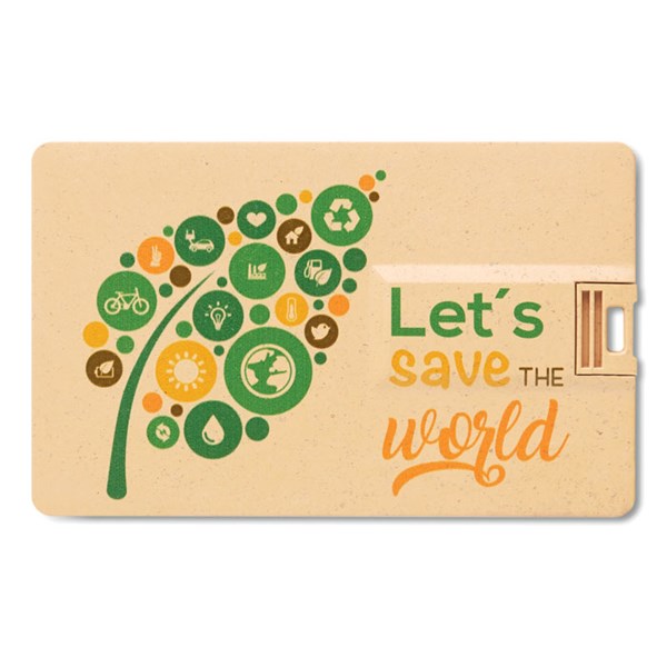 USB flash disk ve velikosti kreditní karty s jednostranným výklopným čipem vyrobený ze slámy a PP. Minimální objednací množství 100 ks. Individuálně baleno po 1 ks.