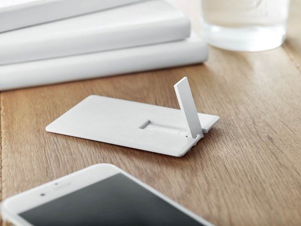 Bílý USB disk ve tvaru kreditní karty o kapacitě 1GB.