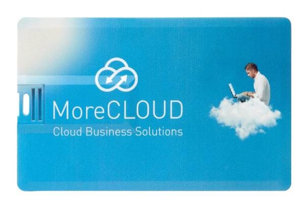 Bílý USB disk ve tvaru kreditní karty o kapacitě 2 GB.