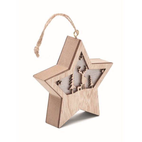 Dekorační hvězda vyrobená z MDF desky s vánočními motivy a se světlem uvnitř. Šňůrka na zavěšení. Dodáváno včetně 3 baterií LR44. V ceně zboží je zahrnut recyklační příspěvek na likvidaci elektroodpadů ve výši 2,00 Kč.