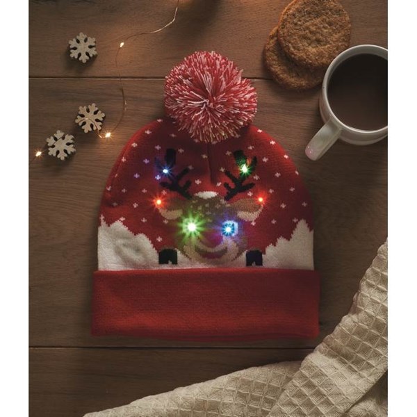 Vánoční pletená čepice s 6 LED světly (3 nastavení) s lemem a bambulí z měkkého elastického akrylu. Včetně 1 baterie CR2032. Obvykle baleno hromadně po více kusech v sáčku. V ceně zboží je zahrnut recyklační příspěvek na likvidaci elektroodpadů ve výši 2,00 Kč.
