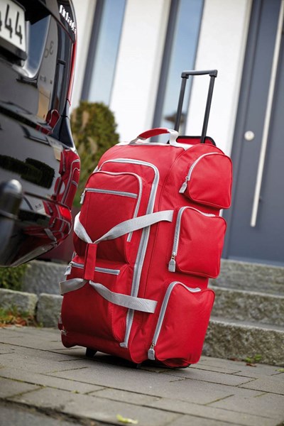 Cestovní taška na kolečkách vyrobená z 600D polyesteru s mnoha kapsami. Tři přední kapsy na zip, hlavní oddíl na zip se třemi dalšími přihrádkami na zip, další přihrádka na zip na zadní straně, jedna polstrovaná rukojeť, systém vozíku lze zasunout do samostatné kapsy na zip, snadno se pohybující plastová kolečka s chrániči rohů, dva chrániče smyku a zemní plastové nožičky.