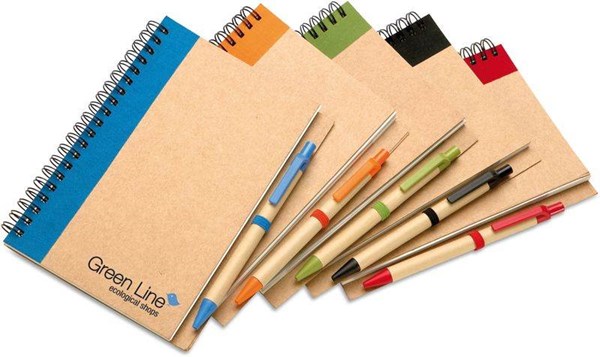 70ti stránkový nelinkovaný blok s kroužkovou vazbou je z recyklovaného papíru a modře píšící kuličkové pero je vyrobeno z biologicky odbouratelného plastu. Blok i tužka mají stejně barevný dekor.
