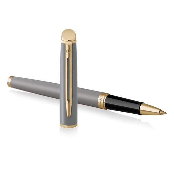 Roller Waterman Hémisphére The Understated Edit Stone Grey GT s tělem a víčkem z nerezové oceli pokryté metalickým lakem v šedé barvě. V kombinaci s doplňky pokovenými zlatem. Úchopová část z černé pryskyřice. Nasazovací víčko, standardní náplň do rollerů. Obsahuje černou náplň. Lze používat náplně do rollerů i do kuličkových per. Dodáváno v prémiové dárkové krabičce.