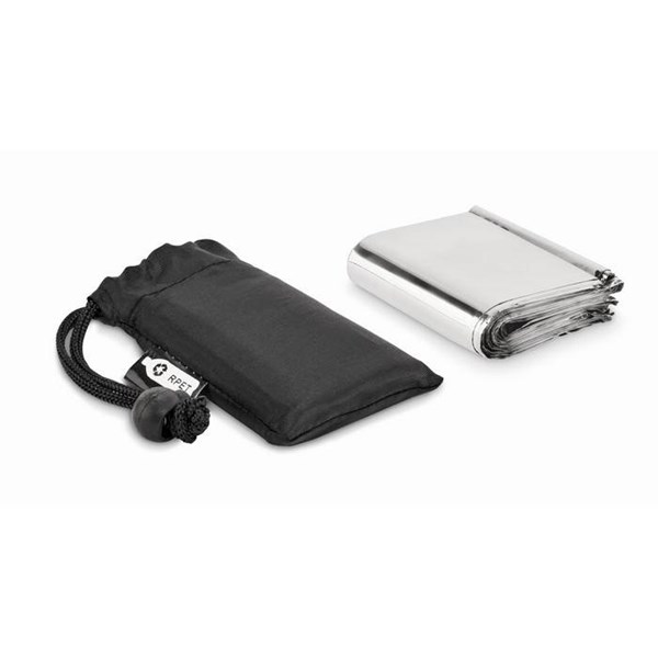Nouzová isotermická hliníková fólie v polyesterovém stahovacím pouzdře z RPET. Rozměr v rozloženém stavu 130 x 210 cm. Materiál aluminium