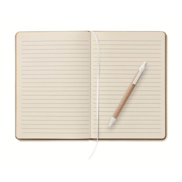 Zápisník A5 s obálkou z tvrdého recyklovaného kartonu. 160 linkovaných stránek (80 listů recyklovaného papíru). Elastický pásek, poutko na pero a záložka. Včetně tlačítkové kuličkového pera s tělem z recyklovaného papíru. Modrý inkoust.