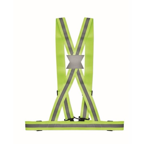 Nastavitelný 360° vysoce viditelný reflexní pás na tělo se stříbrnými pruhy. Univerzální velikost. Složení 70% polyester, 30% elastan. Plastové černé doplňky. Na zadním křížení je stříbrná plocha pro umístění potisku o rozměru 35 x 40 mm (jen transferový tisk-není vhorný drobný text). Na přední plastovou černou sponu lze umístit menší potisk tampoprintem o velikosti max. 30 x 15 mm.